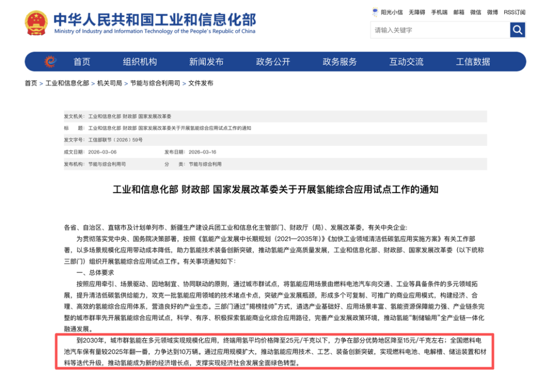 3月16日,工业和信息化部、财政部和国家发展和改革委员会联合印发了《关于开展氢能综合应用试点工作的通知》。